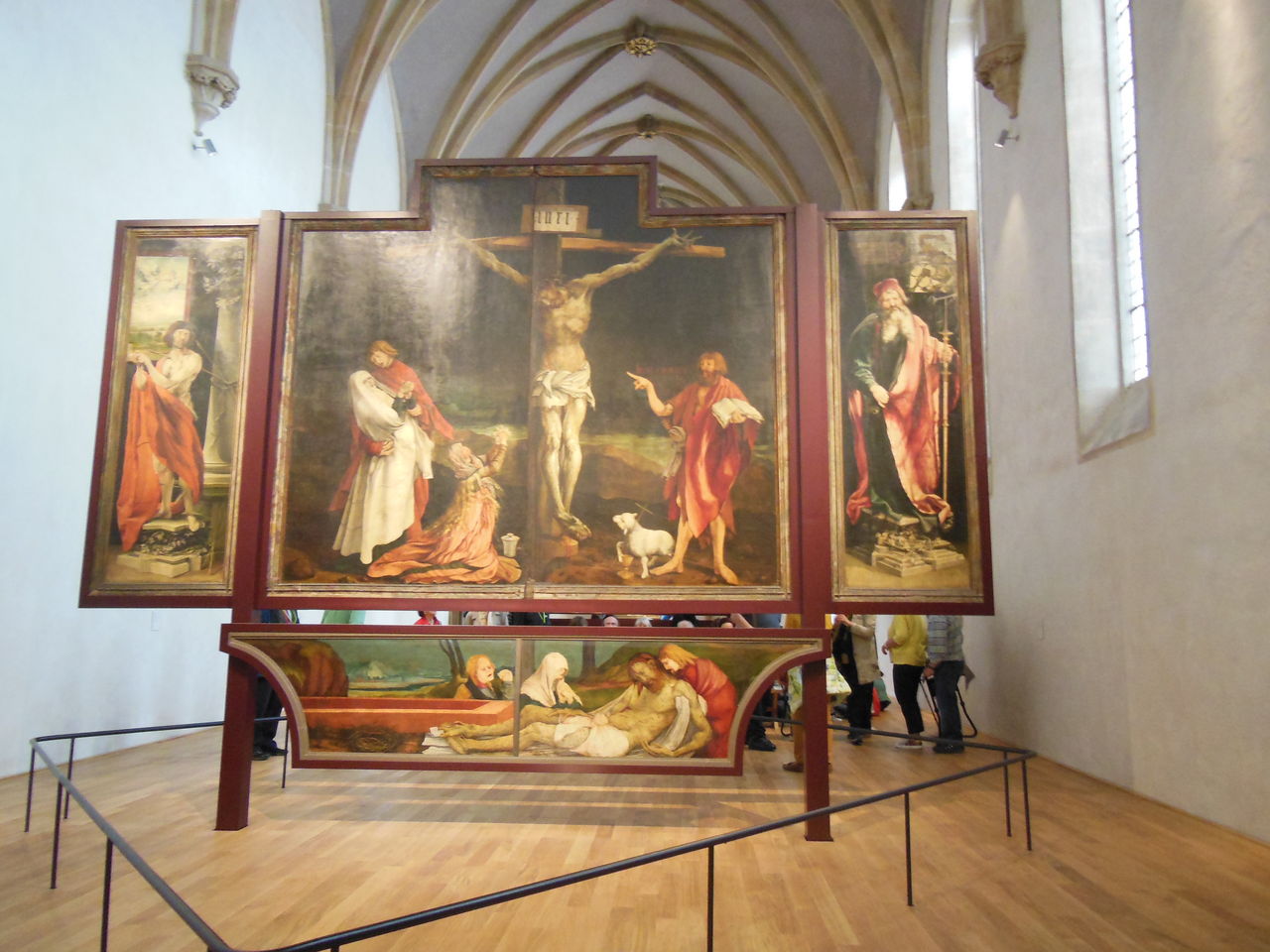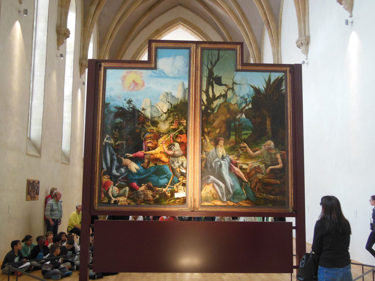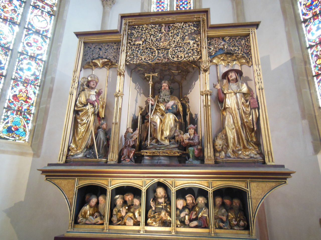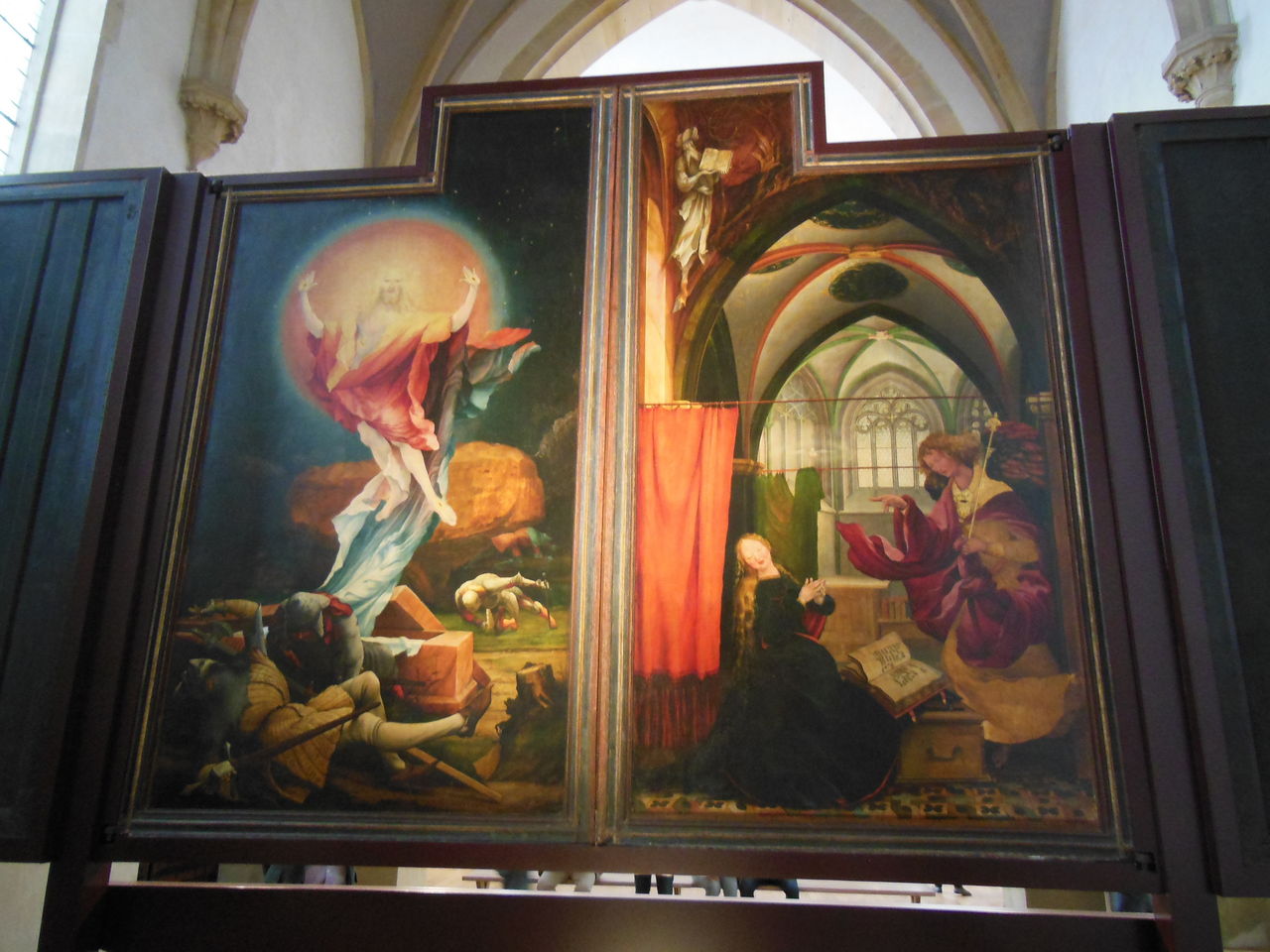 中央パネルはゴルゴダの丘のキリスト降架から包衣の場面です。右パネルには塔と聖バルバラです。聖バルバラは、発熱、急死、鉱山、鍛冶屋、火や危険な作業の守護聖人です。祭壇画を閉じると、左側に結婚拒否の聖ウィルゲフォルティス、右側が性に奔放だったがその後改悛したエジプトのマリアです。両方とも、独身への励ましです。