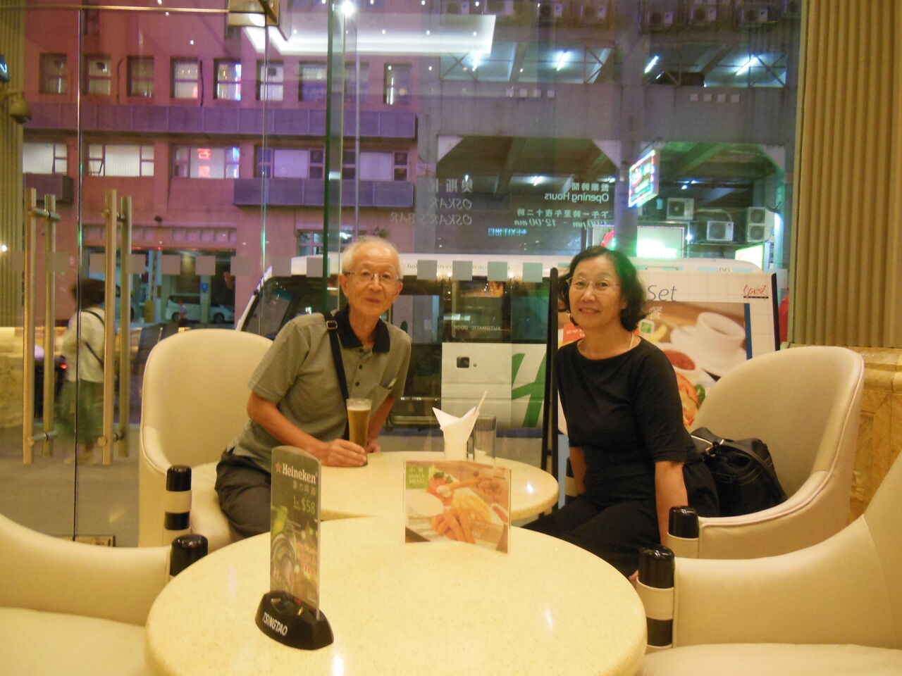 バーテンダーが二人の写真を撮ってくれるというので、お願いしました。ウエルカム・ドリンクで記念撮影