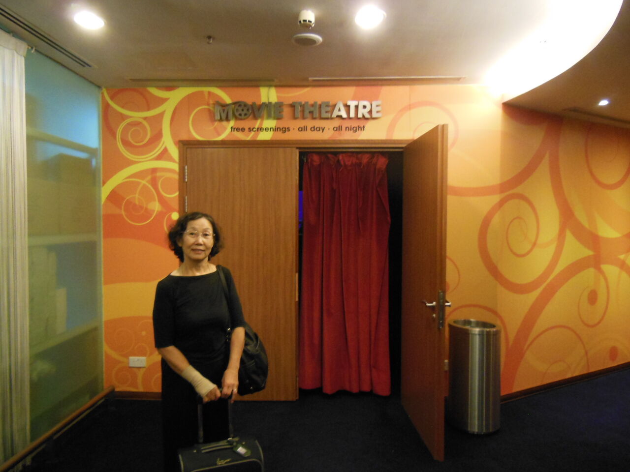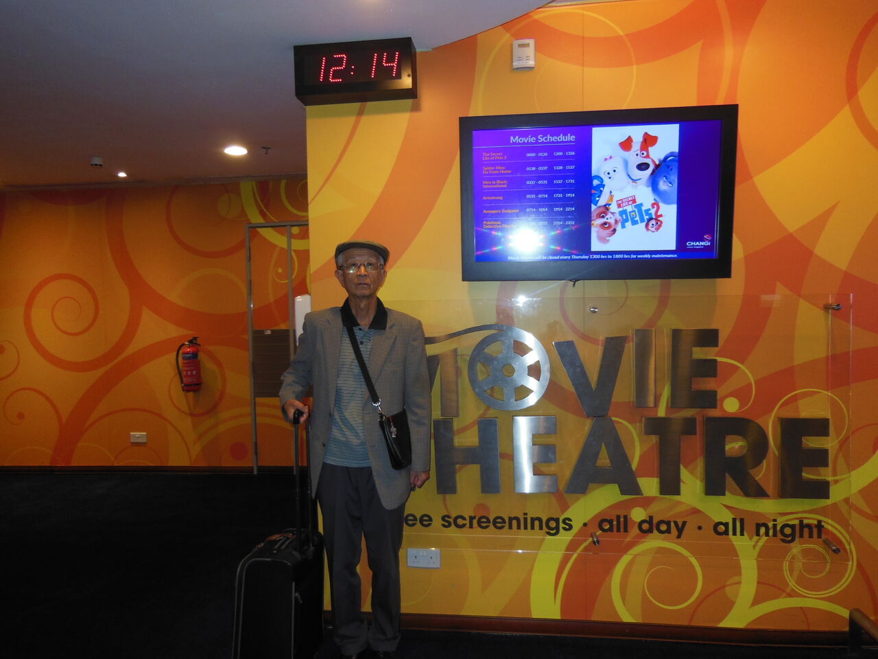 空港内の24時間無料映画館のモニターの前で